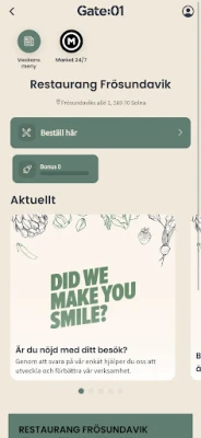 Husets restaurang heter Food & Co och har ett härligt saluhalls-koncept. Här kan du välja mellan rätter från fyra olika kök med olika inriktningar och prisnivåer. Avnjut sedan maten i en fantastisk miljö med utsikt mot husets park och damm. Är vädret fint finns det också en brygga precis utanför med många sittplatser och ett riktigt härligt solläge. Just nu moderniserar vi också vår Bistro och inom kort kommer det att serveras lite lyxigare alternativ här. Gate:01 inrymmer också det trevliga café Deli Marché mitt i huset, där det serveras allt från hälsofrukostar till snabba luncher och kaffe i världsklass från vår egen barista.