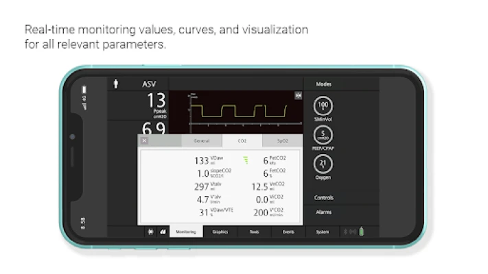 - Real‑time monitoring values for oxygenation and ventilation
