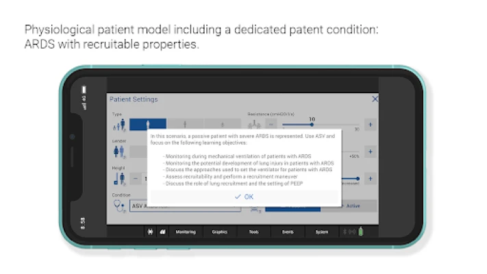 - Monitor how your ventilation strategy affects the patient outcome in real time, thanks to the physiologic patient model
