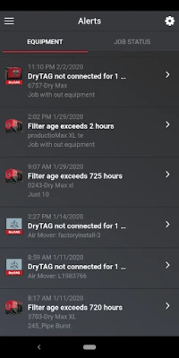 • Equipment Alerts – Equipment turned off, last known location, filter, DryTAG battery level