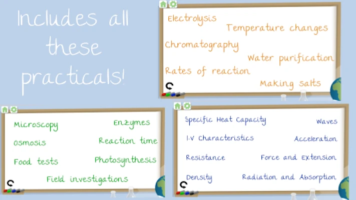 The main purpose of the Science Practical Simulator is to help revise for science exams. Go over what has been taught in class and test yourself with the method quiz after each practical.