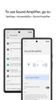 • Turn Sound Amplifier on and off using the accessibility button, a gesture, or Quick Settings. Learn more about the accessibility button, gesture and Quick Settings: https://support.google.com/accessibility/android/answer/7650693